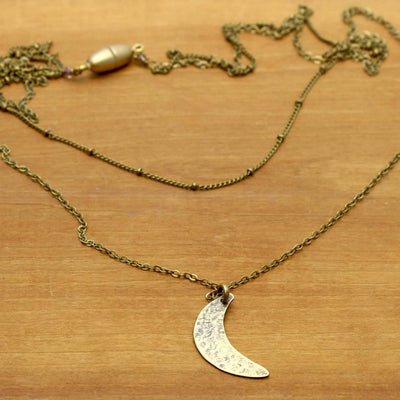 These beautiful yet simple crescent moon hoop earrings are perfect for anyone enthralled by la luna. The moons are solid brass and hammered to give them a natural moon-like texture.  After adding the texture, we add a sterling silver or antique brass finish to them.  The hoops, which are either sterling silver or 14k gold filled are approx 1" in diameter.
