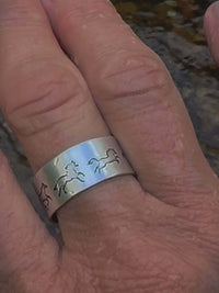 Ever dream of being a part of the wild west or just love horses with all your heart? Get carried away with the Wild Horses Adjustable Ring. Several galloping mustangs surround this beautiful ring and are the perfect gift for anyone or just yourself!