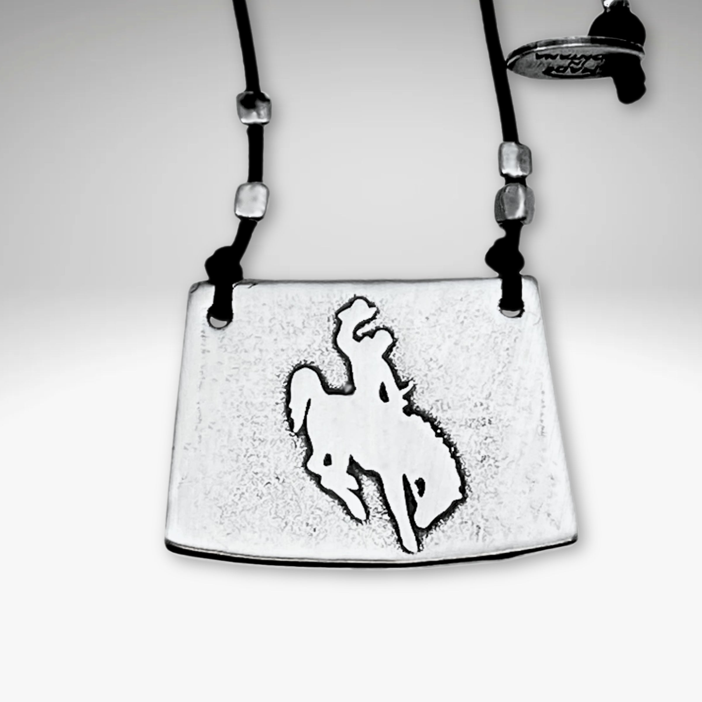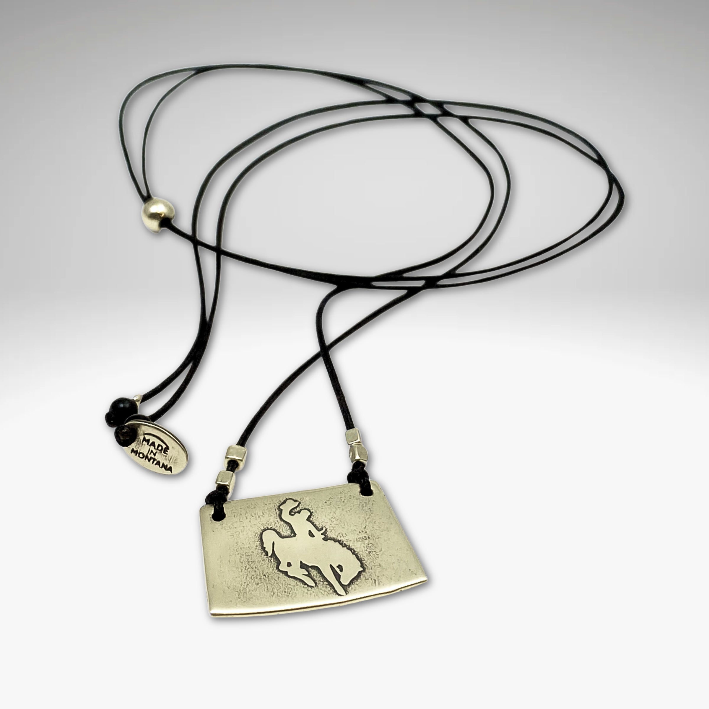 Carry your dream of the wild west with the Steamboat AKA the Bucking Bronco necklace. Crafted from raw brass, this simple silhouette of a cowboy or cowgirl riding a wild horse is created using an acid-free etching process. An adjustable cable chain up to 18" or monofilament cord up to 30" completes the piece.