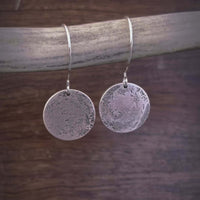 Bring all good things into your orbit with this simple pair of moon drop earrings, which are a great everyday earring. We hammer the raw brass 0.6" round disks to create the moon features and then finish in either matte silver or antique brass (Click here to learn more about our finishing process)