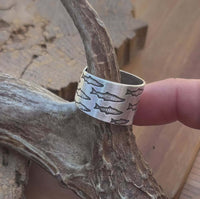 Our Salmon Run adjustable ring will make a perfect gift for any outdoor enthusiast, fish lover or angler. Crafted with raw brass, the ring features an acid-free etching process that results in an eye-catching design of salmon swimming around the band. Show your appreciation of these gorgeous creatures, and of wild waters, with this handmade 1/2-inch wide ring. This style is offered in two finishes: Matte Silver and Antique Brass. Click here to learn more about our process.
